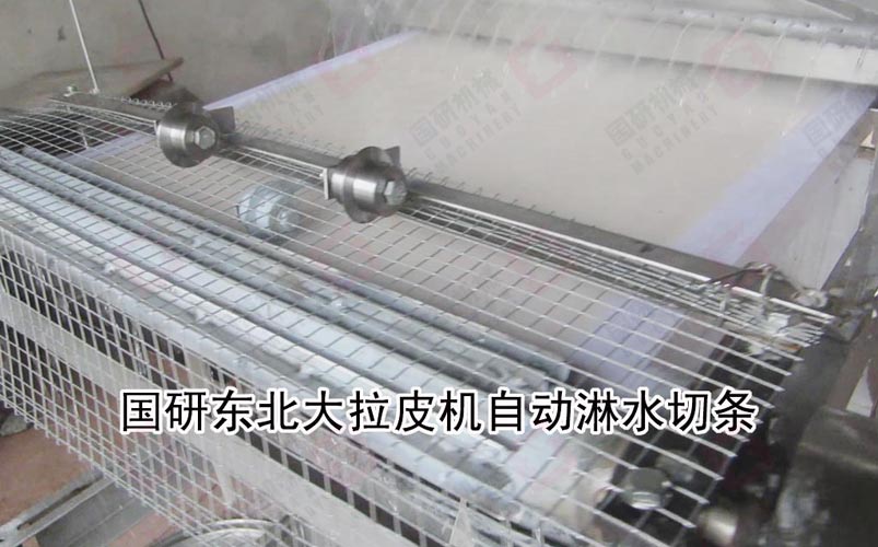 国研牌东北大拉皮机(粉皮机)采用自动下浆、蒸汽蒸熟,自动淋水分离 ,自动切条、切片(根据客户的需要订制)。生产过程可不需要专人操作,自动化生产。生产的拉皮晶莹剔透,韧性强,口感好,生产效率高。每公斤淀粉可生产拉皮4.5-5.5公斤,该系列产品有多个规格,适合不同投资规模的客户需求,办食品加工厂,餐饮连锁店,单位或学校食堂适用。