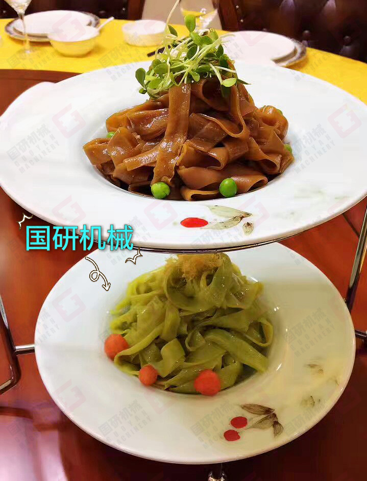 5、该机生产的拉皮、粉皮厚薄可任意调节,保全了原料的全部营养成份,味道鲜美,清亮剔透。
