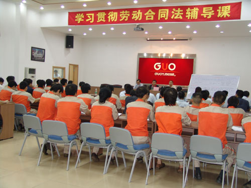 5月9日下午,广州市国砚实业发展有限公司、广州市安博官方网站设备制造有限公司在总部大会议厅举行了声势浩大的学习《劳动合同法》活动。该活动由公司党支部书记、副总经理王声跃主持,广东注明律师事务所——广东德法理律师事务所、我司常年法律顾问黄文芳主任律师担任主讲。
